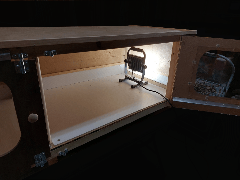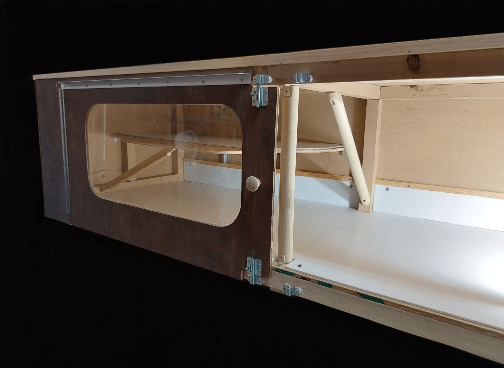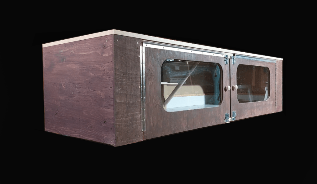 Dimensions: 6′ wide, 2′ deep, 1′-6″ tall. Exterior grade plywood, pine structure, polycarb liner, stainless steel hinges, latches, and aluminum girts. Hardwood pulls. Galv vents not shown.